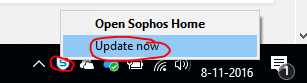 Klik hiervoor rechtsonderin de taakbalk met de rechtermuisknop op het Sophos icoontje en kies “Update now”