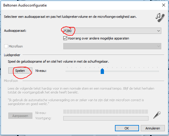 Selecteer hier weer de telefoon als je Audioapparaat, pak de hoorn op en klik op Spelen zodat je kunt luisteren of het afspeelvolume goed staat.
