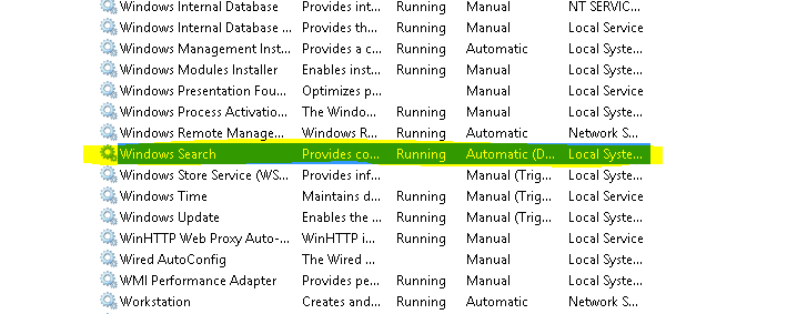 Als dit klaar is zul je bij het Services overzicht de Windows Search service er tussen zien staan. Als deze op Running staat is alles in orde.