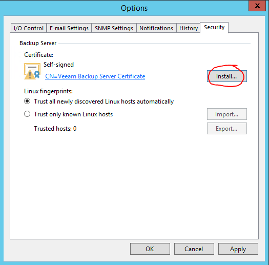 Open Veeam en ga naar het menu General Options en vervolgens naar het Tabblad Security.