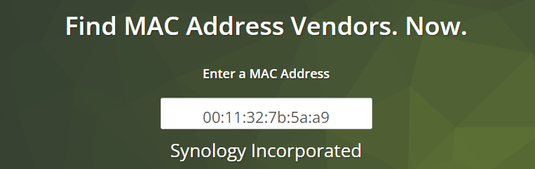 Wireshark kon ook zien dat achter dit MAC adres een Synology zit maar wanneer dat niet bekend is kun je eens proberen om via deze website op te zoeken welke fabrikant achter het MAC adres zit.